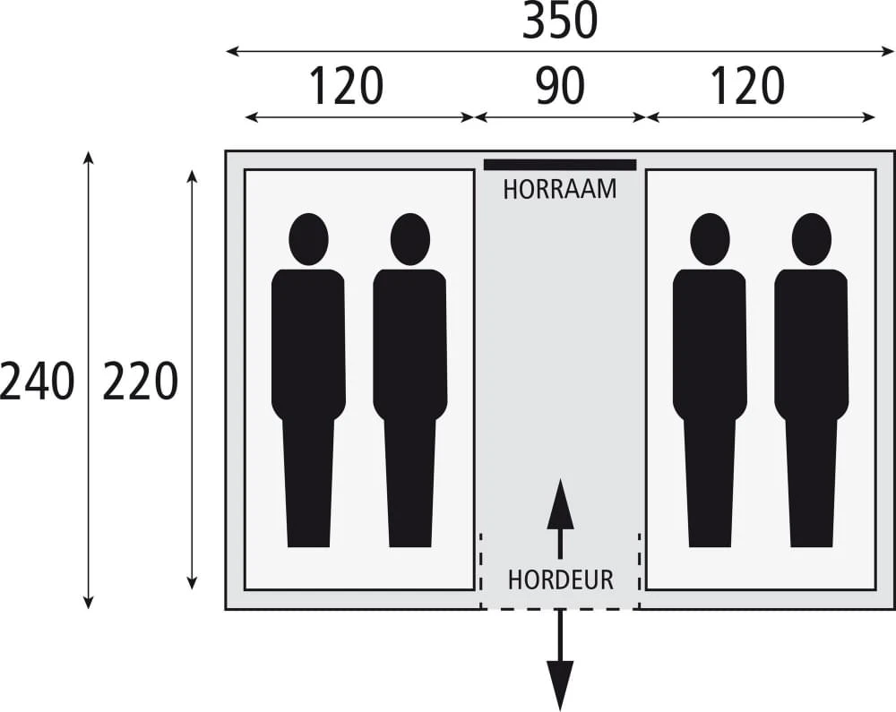 Met twee slaapcabines met elk een breedte van 120 cm is de Bardani Amigo 350 de ruimste vis-a-vis tent in zijn klasse. Ondanks deze brede slaapruimtes kan je nog steeds spreken van een bijzettent. Hou wel in de gaten of hij op de plek past naast de caravan/camper.