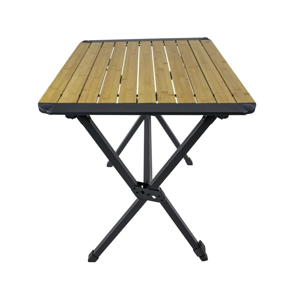 Naast de grotere Maryland variant van 111 x 72 is deze Camping Roltafel van Bo–Camp net iets compacter, maar nog steeds met de stoere uitstraling van een zwart frame en een mooi afgewerkt bamboe tafelblad. Behalve dat hij bij elke tent fantastisch zal staan heeft deze campingtafel ook het grote voordeel dat compleet en eenvoudig uit elkaar gehaald kan worden en daardoor heel erg compact op te bergen is. Dus als je nog ergens een gaatje hebt tussen alle andere bagage dan zal deze daar makkelijk tussen passen. De gekruiste poten zorgen voor extra stevigheid en door de verstelbare poot is het mogelijk om de tafel ook op ongelijke grond mooi recht te zetten.