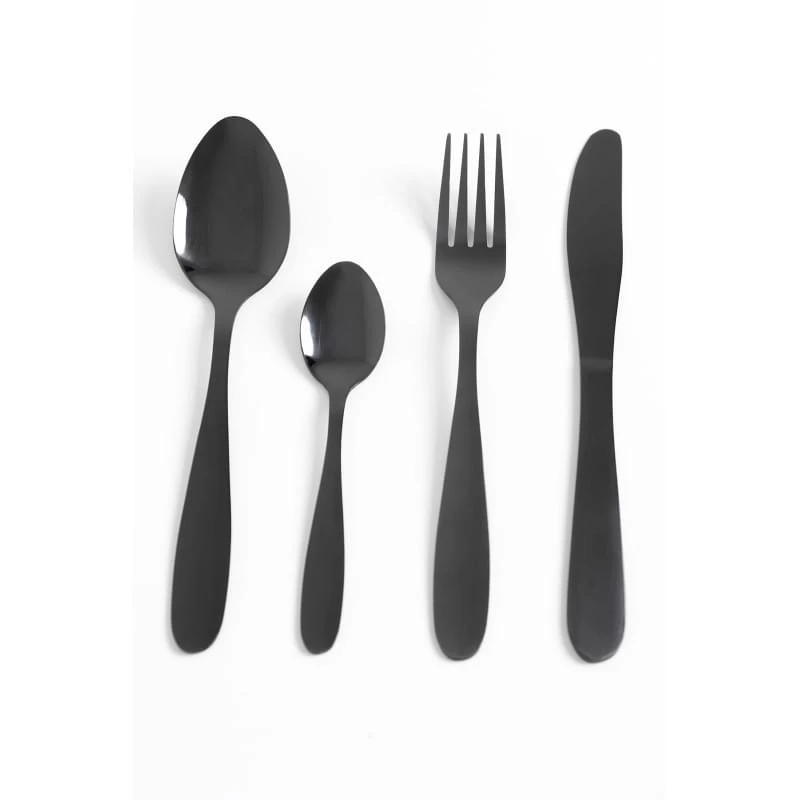 De 16 delige bestekset voor 4 personen heeft een matglanzende zwarte afwerking en kan gewoon in de vaatwasser. De RVS bestekset bestaat uit, 4 messen, 4 vorken, 4 lepels en 4 theelepels.