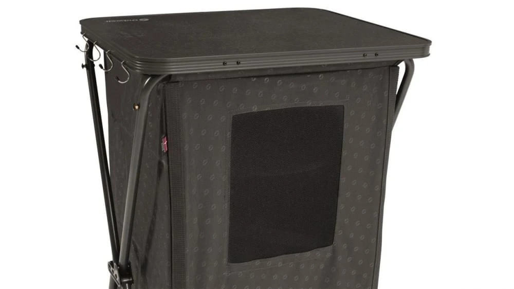 De campingkast heeft drie uitneembare planken waarvan twee grote massieve planken met een draagvermogen tot 10 kg per plank, en een gaasplank bovenin met een draagvermogen tot 5 kg. Verder zit aan de zijkant van de kast een klein opberg vak waar je bijvoorbeeld je bril of wat zonnebrand in kwijt kan. De ophanghaken aan de zijkant bieden plaats voor een handdoek of theedoek. Voor nog meer opbergruimte zijn er ook bevestigingspunten gemaakt aan de zijkant voor de Neat’N’Tidy organisator M (optioneel verkrijgbaar).