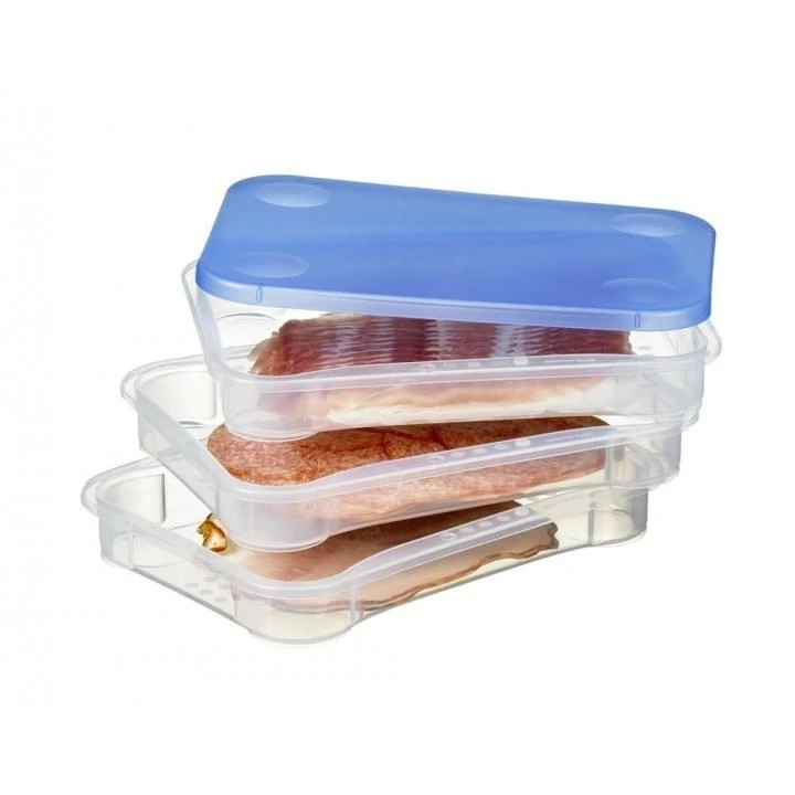 Deze Sunware vleeswarendoos bestaat uit 3 aparte bakjes en een deksel. In deze doos kun je de vleeswaren bewaren wanneer je deze in de koelkast zet. De bakjes zijn BPA-vrij en kunnen temperaturen aan van +120°C tot -40°C. Hierdoor zijn de bakjes ook geschikt voor de vriezer, magnetron en vaatwasser.